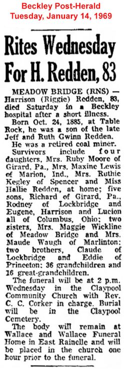 3. William "Big Will" Redden ( James Harrison Redden & Eliza Kidwell) (William Redden Sr. & Fanny Kaylor) William "Big Will" Redden was born the 1st of September 1856 in Raleigh County, Virginia. he married Mary Elizabeth Bragg in 1887. Mary Elizabeth Bragg was born the 5th of June 1867 in Raaleigh County West Virginia, She died the 18th of December 1945 in Raleigh County, West Virginia. William Redden died the 20th of December 1925 in Raleigh County, West Virginia.